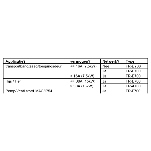 Binnen de Mitsubishi frequentieregelaar serie onderscheiden we 4 lijnen; de FR-D700, FR-E700, FR-F700 en FR-A700