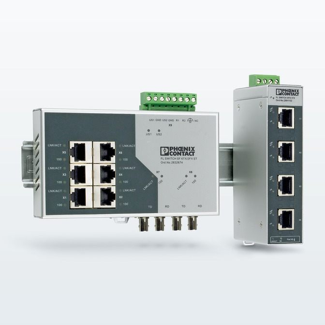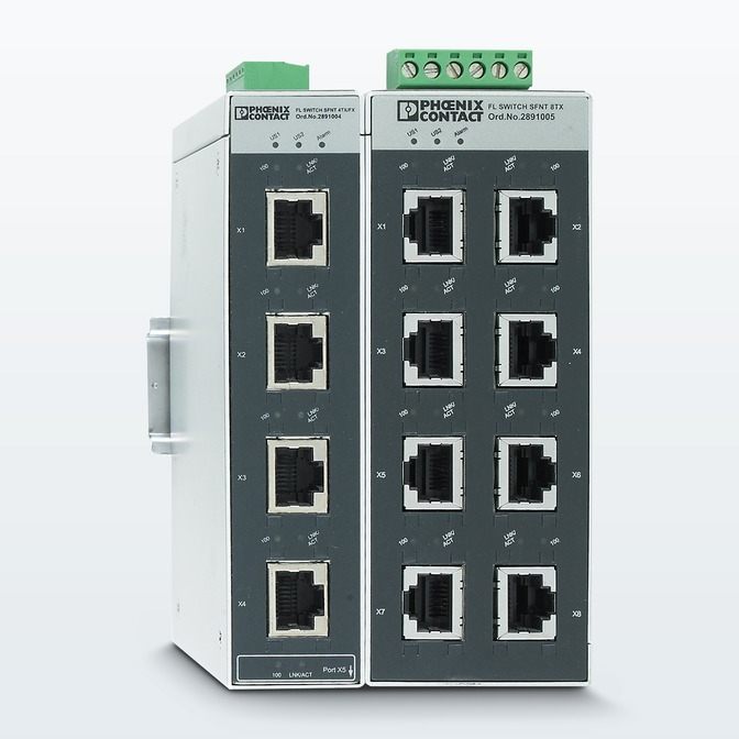 Unmanaged Switches van Phoenix Contact onderscheiden zich met standaardfuncties, een variabel aantal poorten en verschillende bouwvormen. Naast switches voor de montagerail bieden wij ook switches in 19“-bouwvorm en voor de veldmontage (IP67). De Fast Ethernet- en Gigabit-switches met een hoge stoorvastheid, robuuste metalen behuizing en een breed temperatuurbereik zijn volledig geschikt voor industriële toepassingen in permanent bedrijf. Speciale varianten voor Power-over-Ethernet maken een zeer eenvoudige installatie van uw eindapparaten mogelijk. Kies de Unmanaged Switch die bij uw toepassing past.
