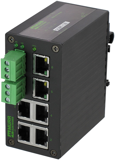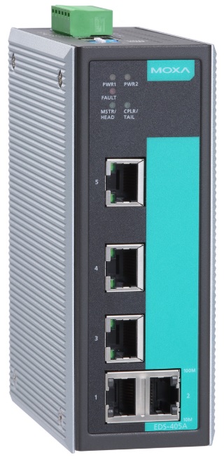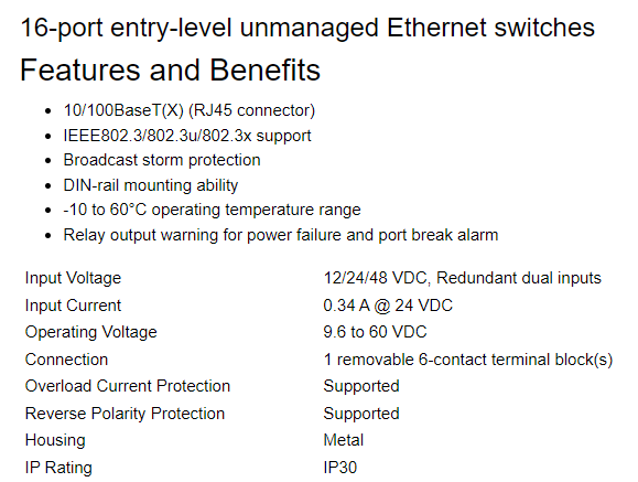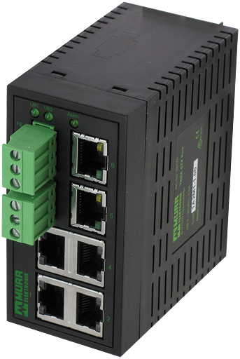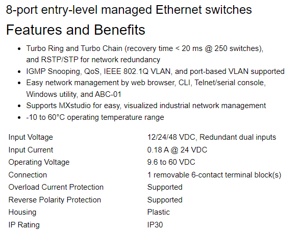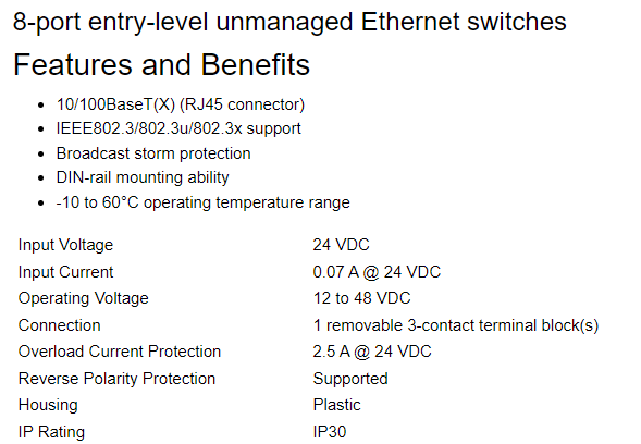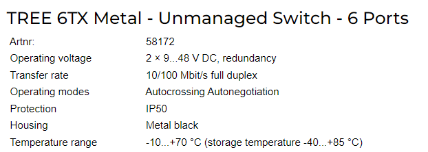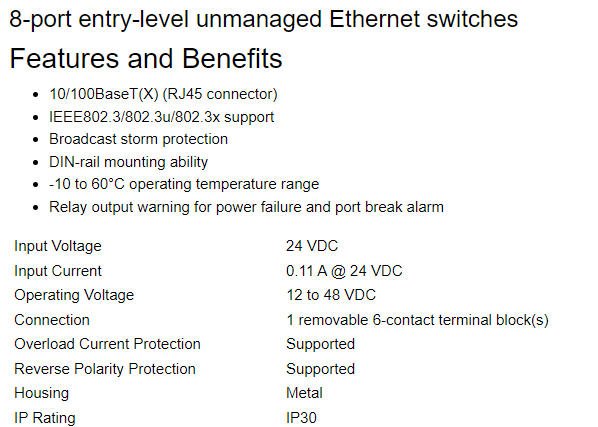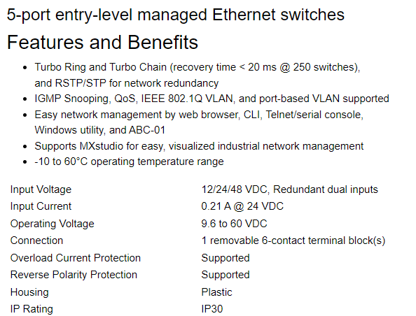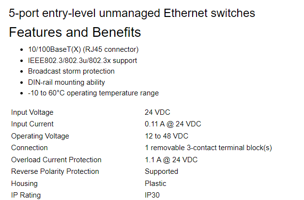 - Ports: 5 | 10/100: 5 | 100Fiber: – | Temp.: -40˚ / 80˚C | Power: 10-30VDC | IP: 30 | Case: DIN Rail, Metal