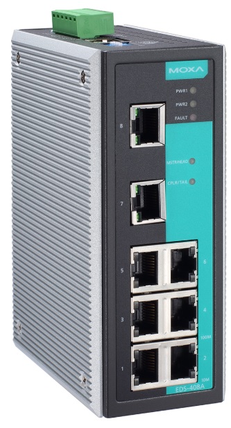 - Ports: 8 | 10/100: 8 | 100Fiber: – | Temp.: -40˚ / 70˚C | Power: 10-30VDC | IP: 30 | Case: DIN Rail, Metal