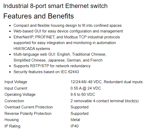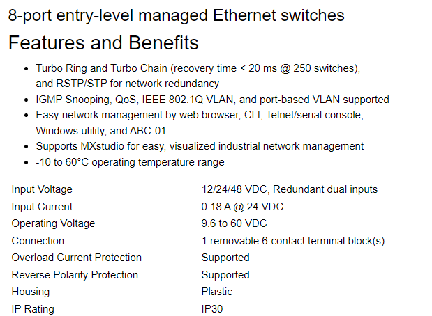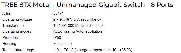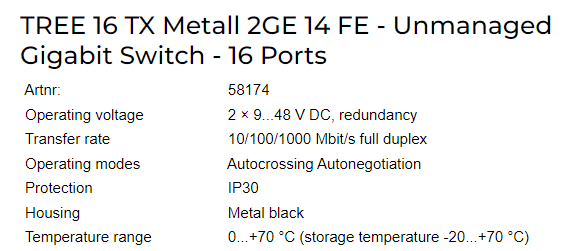 - Ondersteunde functies: Modbus TCP, VLAN, QoS, SNMP, SMTP, IGMP Snooping, LLDP, Jumbo Frame 10.240 Byte