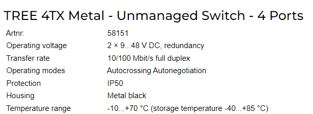 - Ports: 4 | 10/100: 4 | 100Fiber: – | Temp.: -40˚ / 80˚C | Power: 10-30VDC | IP: 30 | Case: DIN Rail, Metal
