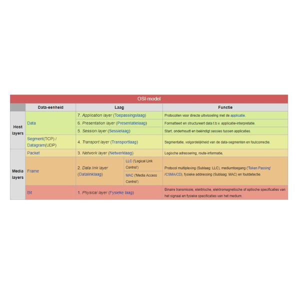 Het OSI-model onderkent zeven relevatie stadia (zowel fysiek als logisch). De bovenste laag (laag “7”) van het model wordt de toepassingslaag genoemd. Binnen die laag hebben digitale gegevens een vorm die nog maar één bewerking hoeft te ondergaan naar van betekenisvolle tekst, getallen en/of afbeeldingen (zoals bv. ASCII en JPEG). De onderste laag van het model (laag “1”) wordt de fysieke laag genoemd. Daar is slechts nog sprake van een (foto-)elektrisch signaal dat geschikt is voor transport over een IT-infrastructuur. Onderweg van laag 7 naar laag 1 worden de oorspronkelijke gegevens keer op keer opnieuw ingekapseld door, bij elke overgang tussen lagen, steeds nieuwe data toe te voegen. Deze datatoevoegingen zijn noodzakelijk voor drie hoofdzaken: de route over de infrastructuur, volgordelijkheid, en foutcorrectie. Er bevinden zich binnen het OSI-model geen lagen uitsluitend ten behoeve van beveiliging van de uitgewisselde gegevens door middel van bijvoorbeeld versleuteling, omdat beveiliging niet de essentie van het model is. Het staat fabrikanten van netwerkoplossingen vrij om op elke laag beveiligingsalgoritmen toe te voegen, maar de beschrijving van dergelijke algoritmen bevindt zich altijd buiten het OSI-model.