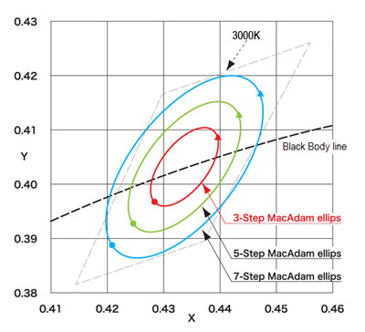 De kleurtolerantie is met led een stuk belangrijker geworden en dat heeft te maken met de hoge mate van “uitval” in het productieproces van led’s. Er is een ideale lijn (black body) waarbij de led’s ook exact de kleur hebben die de bedoeling was, bv. warm wit 3000K. Er komen echter meer led’s uit de productie die onder of boven deze lijn liggen. Er is dus een bepaalde tolerantie en dat wordt aangegeven in stappen (steps). Hoe lager de step, des te kleiner de kleurverschillen.