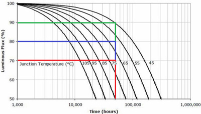 Led producenten adviseren om de Junction temperatuur onder de 85°C te houden en een armatuur producent heeft daarvoor een 2-tal middelen: 1 een hele goede koeling en 2, de led niet tot het uiterste belasten. Toch gaat iedereen daar anders mee om en zien we in de markt bv. 50.000 uur L70/B50, L80/B20 of B10 maar ook L90/B10. Deze grafiek maakt duidelijk welk effect een hogere Junction- en dus ook Case temperatuur heeft op de levensduur.